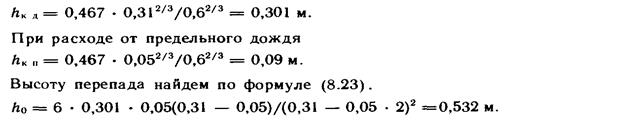 Отметки шелыги главного коллектора после разделительной камеры, м, Zmn = Z — h0 — у. (8.36) Значение у можно принимать 0, 1 м. Пример. Расчетный расход ц,, расход от предельного дождя qlim приня- Критическую глубину при расчетном расходе находим по формуле (8.21): '