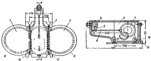 Рисунок 26 – Поилка ПСС-1 крышкой, в верхней части корпуса чаши установлен приемник воды с клапанным механизмом, при нажатии животного мордой на крышку (педаль) она поворачивается относительно шарнира и нажимает на стержень клапана регулировочным болтом. Клапан сжимает амортизатор и отходит от седла, пропуская воду из водопровода в чашу. Автопоилка спаренная ПАС-2А для одновременного поения двух свиней. Снабжена чугунным корпусом, образующим две поильные чаши и поплавковую камеру между ними (Рисунок 27). В поплавковой камере поплавок соединен с за-