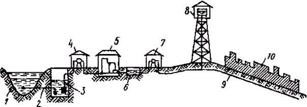В зависимости от конкретных условий (рельеф местности, мощность водоисточника, надежность электроснабжения) применяемое оборудование системы водоснабжения объединяется в различные поточные технологические линии. Схема напорной башенной системы водоснабжения с забором воды из поверхностного источника (реки, пруда) представлена на рис. 1.2. Вода из источника 1 через водоприемник и трубу 2 самотеком поступает в водозаборное сооружение 3 (колодец), откуда насосной станцией 4 первого подъема подается на очистные сооружения 5, где осуществляется улучшение ее качества. После очистки и обеззараживания вода сливается в резервуар 6 чистой воды, из которого насосной станцией второго подъема она перекачивается по водоводу в напорно-регулирующее сооружение – водонапорную башню 8. Далее вода поступает в водопроводную сеть 9, подводящую ее к объекту водоснабжения 10 (ферме, комплексу, населенному пункту).