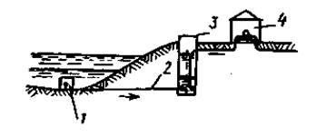 а б а – водозаборное сооружение берегового типа: 1 – водоприемник; 2 – самотечная труба; 3 – задвижка; 4 – береговой колодец; б – русловый водозабор: 1 – водоприемник; 2 – самотечная труба; 3 – береговой колодец; 4 – насосная станция Рисунок 1.3 – Схемы водозабора поверхностных источников