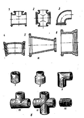 1 – фланцевый тройник; 2 – крест раструб-фланец; 3 – колено раструб-гладкий конец; 4 – раструбный отвод; 5 – фланцевый переход; 6 – патрубок фланец-раструб; 7 – муфта прямая; 8 – муфта переходная; 9 – угольник; 10 – тройник; 11 – крестовина; 12 – ниппель Рисунок 1.7 – Чугунные фасонные части (а) и стальные фитинги (б)