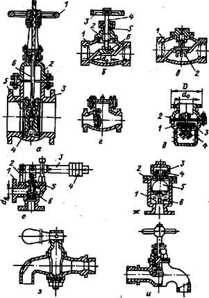 а – задвижка: 1 – маховичок; 2 – крышка; 3 – корпус; 4 – вентиль (запорный муфтовый); 5 – клин; 6 – шпиндель; б – кран: 1 – корпус; 2 – крышка; 3 – маховичок; 4 – шпиндель; 5 – сальник; 6 – золотник; в – обратный муфтовый клапан: 1 – корпус; 2 – клапан; г – обратный фланцевый клапан; д – приемный клапан: 1 – корпус; 2 – крышка; 3 – клапан; 4 – сетка; е – предохранительный клапан рычажного типа: 1 – корпус; 2 – стойка; 3 – рычаг; 4 – груз; 5 – крышка; 6 – клапан; ж – воздухоспускное устройство (вантуз): 1 – корпус; 2 – крышка; 3 – гайка; 4 – отверстие для выхода воздуха; 5 – шар; 6 – упор; з, и – водоразборный кран (пробочный, вентильный) Рисунок 1.8 – Водопроводная арматура Действует колонка следующим образом. При нажатии на рукоятку 13 трубчатая штанга 4 вместе с грузом 2 поднимается и открывает клапан 8. Вода в сети через эжектор 10 поступает в подающую трубу 11 и далее выводится наружу через носок 3. Если рукоятку 13 отпустить, то под действием груза 2 трубчатая штанга возвратится в исходное положение и перекроет клапан 8. При этом проход воды в подающую трубу 11 из сети прекратится. После того как колонка будет закрыта, оставшаяся в подающей трубе вода сливается в нижнюю подземную часть подставки 5, откуда при последующих включениях она через эжектор засасывается и удаляется из подставки. Для обеспечения нормальной работы колонок этого типа давление в сети должно быть не менее 0, 1 МПа.