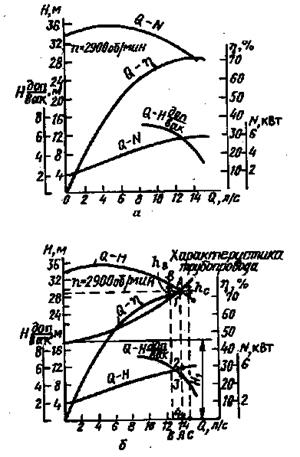 Рисунок 1.13 – Рабочая характеристика центробежного насоса ЗК-9 (а) и совмещение ее с характеристикой трубопровода (б)