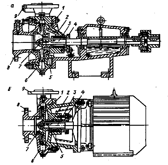 1 – рабочее колесо; 2 – сальниковые набивки; 3 – вал; 4 – сальник; 5 – шпонка; 6 – корпус; 7 – гайка; 8 – входной патрубок; 9 – нагнетательный патрубок Рисунок 1.15 – Консольные насосы типа К (а) и КМ (б)