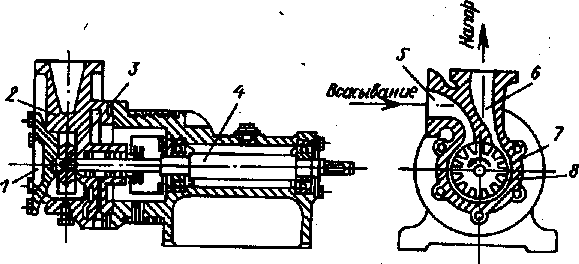 1 – головка; 2 – стяжка; 3 – клапан; 4 – ступица верхнего подшипника; 5 – рабочее колесо; 6 – направляющий аппарат; 7 – обойма; 8 – диск; 9 – вал; 10 – ступица основания; 11 – соединительная муфта Рисунок 1.16 – Погружной насос типа ЭЦВ Погружной насос представляет собой сочетание центробежного насоса и погружного электродвигателя. В насосах типа ЭЦВ валы связаны жесткой муфтой, а в насосах типа ЭПН двигатель и насос соединены опорным фланцем. Погружной многоступенчатый насос типа ЭЦВ представлен на рисунке 1.16. Конструкция его электродвигателя предполагает эксплуатацию под водой. Марка насоса, например ЭЦВ6-10-140, расшифровывается так: Э – электропогружной; Ц – центробежный; В – высоконапорный; 6 – уменьшенный в 25 раз минимальный диаметр скважины, мм; 10 –подача, м3/ч; 140 – напор, м. Основные показатели насосов ЭЦВ и ЭПН приведены в табл. 1.7. Объемные насосы. Лопастные вихревые насосы типа В и ВК предназначены для перекачки чистой воды из открытых водоемов и шахтных колодцев при высоте всасывания 5…7 м, Эти самовсасывающие насосы не требуют залива воды перед повторным запуском, достаточно залить ее в корпус насоса только перед первым пуском. Насосы этого типа применяются для подачи воды из неглубоких (до 8 м) шахтных колодцев и открытых источников. Принцип действия вихревого насоса можно уяснить из схемы, приведенной на рисунке 1.17. Кольцевая полость 1 в корпусе насоса соединяет всасывающий и нагнетательный патрубки. В этой полости жидкость вовлекается в круговое движение относительно ее осевой линии. Такое движение, как видно из рисунка 1.18, обусловлено своеобразным «трением», которое возникает в пространстве, образуемом в корпусе межлопаточными ячейками 8 рабочего колеса 3 и примыкающим к нему кольцевым каналом. Как показано в сечении А – А (см. рисунок 1.17, б), под действием центробежных сил по периферии колеса возникает интенсивное вихревое циркуляционное течение (отсюда и название вихревой насос). На него накладывается еще одно течение, вызванное давлением лопаток колеса на жидкость, т. е. перепадом давления на передней и задней сторонах лопаток. Обмен импульсами за счет вторичных течений столь интенсивный, что при равных размерах и частотах вращения вихревой насос создает напор в 3…5 раз больший, чем центробежный насос.