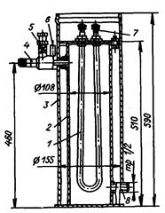 1 – ТЭН; 2 – корпус; 3 – наружный кожух; 4 – отводящий штуцер; 5 – предохранительный клапан; 6 – гнездо для термометра; 7 – вывод нагревателей; 8 – подводящий штуцер Рисунок 1.42 – Проточный электронагреватель ЭПВ-2А