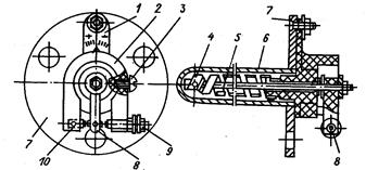 1 – корпус; 2 – контактная головка; 3 – стопорный винт; 4 – биметаллическая спираль; 5 – валик; 6 – кожух; 7 – фланец; 8 – рычаг; 9 – регулируемый контакт; 10 – неподвижный контакт Рисунок 1.44 – Температурное реле
