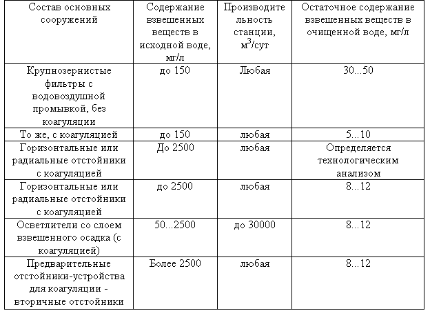 Таблица 7.2 - Примерный состав сооружений станций очистки воды для производственных нужд