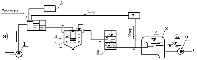 В большинстве случаев станции ХВО располагают вблизи источника водоснабжения, следовательно, недалеко от НС I. По принципу перемещения воды в сооружениях станции различают самотечные и напорные системы. Наибольшее распространение в практике водоочистки имеют схемы очистных сооружений с самотечным движением воды. Вода, поданная насосами I подъема, самотеком проходит все очистные сооружения и поступает в резервуар чистой воды, из которого забирается насосами II подъема.