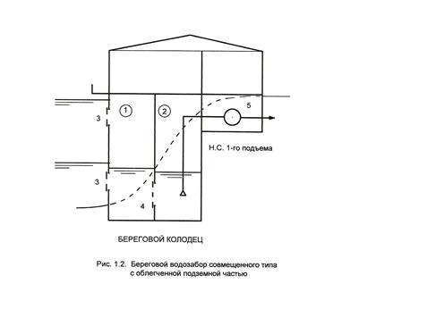 Береговой водозабор совмещенного типа (рис.1.2.) применяется при сложении берега из прочных пород (скала, известняки), небольшой амплитуде колебаний уровней воды (до 6 м), достаточной высоте всасывания насосов (более 4 м).