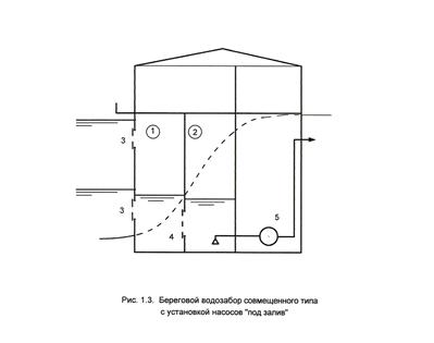 Береговой водозабор совмещенного типа (рис.1.3.) применяется при сложении берега из непрочных пород, достаточно большой амплитуде колебаний уровней воды и необходимости установки насосов «под залив».