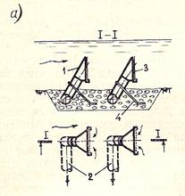 а) с вертикальной решеткой; б) с наклонной решеткой; 1- раструбная воронка; 2 – самотечный водовод; 3 – решетка; 4 – крепеж