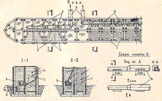 Рис. 6. Ряжевый комбинированный водоприемник усовершенствованного типа 1 – фильтрующие секции; 2 – открытые секции с водоприемными окнами; 3 – цилиндрические вихревые камеры; 4 – решетки; 5 – самотечные водоводы Выбор схемы и компоновки водозаборных сооружений в зависимости от требуемой надежности и сложности природных условий забора воды рекомендуется осуществлять, используя данные табл.13 СНиП 2.04.02-84.