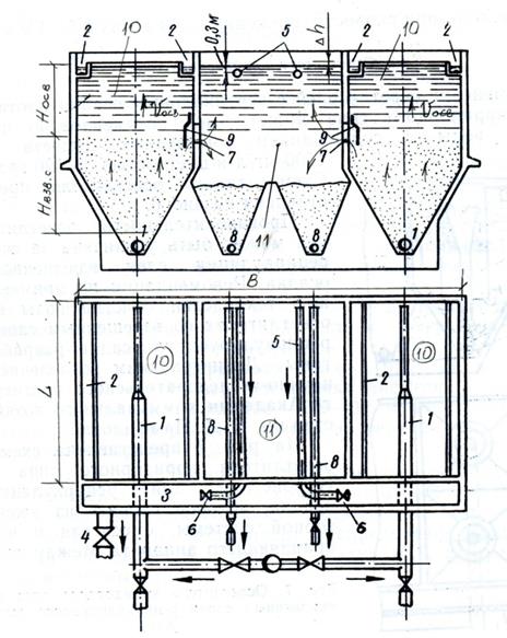 Осветлитель коридорного типа с вертикальным осадкоуплотнителем 1 – перфорированная телескопическая распределительная труба для подачи исходной воды; 2 – лотки для сбора осветленной воды; 3 – боковой карман для осветленной воды; 4 – отвод осветленной воды из осветлителя; 5 – перфорированные трубы для отвода осветленной воды из зоны отделения осадка (система принудительного отвода осадка); 6 – задвижки для регулирования отбора воды из зоны отделения осадка; 7 – осадкоприемные окна; 8 – дырчатые трубы для отвода осадка; 9 –предохранительные козырьки; 10 – зона осветления; 11 – зона отделения осадка