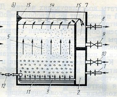Контактные осветлители КО-1 (а) и КО-3 (б) 1, 8 – подача исходной воды и отвод фильтрата; 2, 7 – нижнее и верхнее отделения бокового кармана; 3 – дренаж водяной; 4 – слой гравия, 5 – слой песка; 6 – водосборный желоб; 9, 10 – отвод и подача промывной воды; 11 – дренаж воздушный; 12 – подача сжатого воздуха; 13 – струенаправляющий выступ; 14 – горизонтальный отвод промывной воды; 15 – водослив с пескоулавливающим желобом Обеззараживание воды Обеззараживание воды производят для уничтожения содержащихся в ней патогенных бактерий и вирусов. Для этой цели наиболее часто применяются сильные окислители, такие как хлор и хлорсодержащие реагенты, озон, двуокись хлора и перманганат калия. Кроме использования окислителей обеззараживание может осуществляться бактерицидным облучением, воздействием ионов серебра и мембранной технологией.