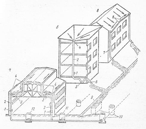 Водостоки зданий 1 - устройство для прочистки; 2 - стояк; 3 - отводные трубы; 4 - водосточная воронка; 5 - гидрозатвор; 6- открытый выпуск; 7 - водосточная труба; 8 - желоб; 9- дождеприемник; 10 – колодец наружной дождевой канализации; 11 - закрытый выпуск; 12 - смотровой колодец Устройство внутренних водостоков. Отвод атмосферных осадков (дождевых и талых вод) с кровель современных зданий осуществляется по трубопроводам, расположенным внутри здания (внутренним водостокам). Область применения их регламентируется соответствующими разделами СНиП 2.04.01-85. Внутренние водостоки состоят из водосточных воронок, отводных трубопроводов (стояков, коллекторов, выпусков) и устройств для осмотра и прочистки (ревизий, прочисток, смотровых колодцев). Внутренние водостоки должны удалять воду с кровли зданий, как при положительных, так и при отрицательных температурах наружного воздуха. Для обеспечения этого предусматривается электрообогрев, обогрев сжатым воздухом, паром и др.