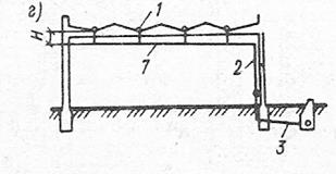 Рис. Схемы сети внутренних водостоков а – перпендикулярная; б – пересеченная; в – с открытым выпуском; г – с подвесным трубопроводом; 1 – воронка; 2 – стояк; 3 – выпуск; 4 – коллектор; 5 – гидравлический затвор; 6 – подача теплого воздуха; 7 – подвесной трубопровод