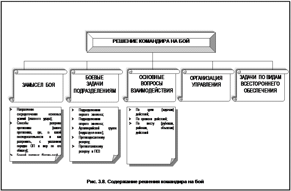 3.4 Принятие решения Искусство управления командира многогранно. Оно прежде всего проявляется в принятии мудрого, дальновидного решения на бой, вытекающего из складывающихся условий обстановки, обеспечивающего воплощение в жизнь требований принципов военного искусства, эффективное использование сил и средств, на достижение внезапности нанесения глубокого удара, решительности действий, дерзкого маневра, сосредоточения усилий в неожиданном для противника месте, выигрыша времени, превосходства в управлении. В решении, как нигде более, находят полное выражение такие командирские качества, как прозорливость и расчетливость, смелость и самостоятельность, способность взять на себя ответственность, умение эффективно использовать оружие и боевую технику, учитывать подготовленность, боевую выучку, морально-психологические качества личного состава, мобилизовать их на выполнение боевой задачи. На рис.3.6 в схематичном виде отражена методика принятия командиром решения на бой. Следует заметить, что метод принятия решения - сложный творческий процесс. Он протекает в остром разрешении противоречий. Образно говоря, это шаг в неизвестное. Командир практически никогда не располагает исчерпывающими достоверными данными об обстановке, в особенности о замыслах и характере действий противника. Будущее всегда лежит в тумане неизвестности и никто не способен дать твердой гарантии в том, что события будут развиваться именно так, как они запрограммированы, что противник не преподнесет сюрпризы, что не произойдет непредвиденное и никто из подчиненных не допустит ошибки, оплошности. Идеальных вариантов в бою не бывает, слишком много в нем непредсказуемых случайностей. По этой причине у командира вполне естественно возникают трудные мышления: а все ли взвешено в решении, все ли предусмотрено, все ли сделано так, как надо. Ведь на него ложится большая ответственность за жизнь людей. Ошибки и просчеты в бою окупаются не иначе как кровью. Как метко заметил К.Симонов «На войне не бывает репетиций, на которых можно сыграть сперва для пробы – не так, а потом так, как надо. На войне нет черновиков, которые можно изорвать и переписать набело. Здесь все пишут кровью, все от начала до конца, от аза до последней точки …»[277]. Известный командарм Великой Отечественной войны генерал армии А.А.Лучинский следующим образом описал свои переживания накануне сражения: «В ночь перед атакой (в Бобруйской операции – авт.) я долго не мог уснуть … тяжело давила лежавшая на мне ответственность за успех предстоящего боя; радовал неукротимый наступательный порыв, с которым наши солдаты шли сражаться за честь и независимость своей Родины; волновала все еще казавшаяся неясной обстановка в стане врага. Сидя в штабном