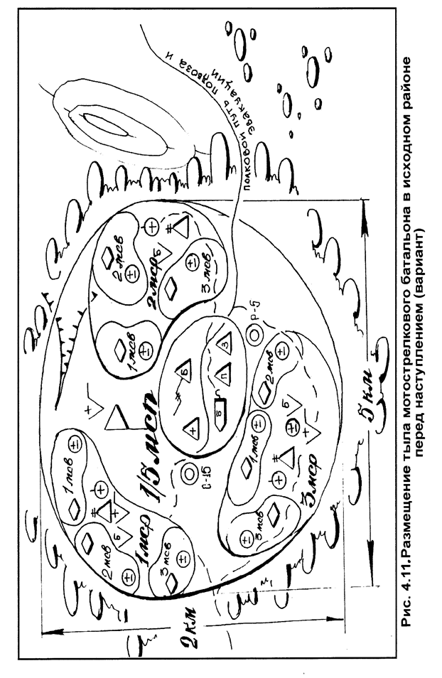 развернуться в предбоевой порядок. Рубеж развертывания во взводные колонны назначается по возможности за складками местности или в местах, укрытых от огня противника, особенно от его ПТУР ближнего действия. При выборе рубежа перехода в атаку учитывается характер обороны противника, степень ее огневого поражения, условия местности, а также способ атаки - осуществляется ли она на боевых машинах пехоты или в пешем порядке. Если атака ведется в пешем порядке, то рубеж перехода в атаку назначается как можно ближе к переднему краю обороны, чтобы сократить до минимума разрыв во времени между моментом нанесения по противнику огневого удара и началом атаки. При действиях на боевых машинах пехоты (БТР) рубеж перехода в атаку выбирается с таким расчетом, чтобы выдвижение к нему подразделений совершалось скрытно, а удаление его обеспечивало ведение действительного огня из основных видов оружия ближнего боя и позволяло подразделениям безостановочно, с высокой скоростью атаковать противника в указанное время («Ч»). При благоприятных условиях обстановки, особенно в ходе развития наступления, подразделения могут атаковать противника, развертываясь в боевой порядок из походных колонн, т.е. непосредственно с марша. Это в значительной степени усложняет противнику провести маневр и в то же время способствует достижению внезапности. Организация боя в этом случае осуществляется обычно в движении или во время коротких остановок. Подразделения переходят в атаку по мере подхода их к переднему краю обороны. При всех способах перехода войск в наступление оно должно быть тщательно обеспечено, особенно в тыловом отношении. На рис 4.13 показан вариант размещения тыла мотострелкового батальона при наступлении сходу.