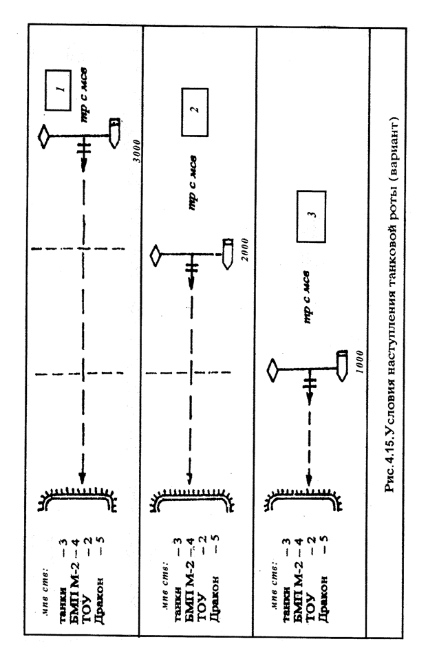 ния в глубину и овладение важным рубежом, в других - отражение контратаки противника. В зависимости от поставленной задачи мотострелковой роте могут придаваться минометная (артиллерийская) батарея, противотанковое, гранатометное, огнеметное и инженерное саперное подразделения, а танковой роте артиллерийская батарея, мотострелковый взвод и инженерно-саперное отделение. Кроме того, мотострелковая (танковая) рота может поддерживаться огнем артиллерийской (минометной) батареи и взаимодействовать с танковой (мотострелковой) ротой (взводом). Мотострелковая рота, приданная танковому батальону, как правило, повзводно переподчиняется танковым ротам. Танковая рота, приданная мотострелковому батальону, действует обычно в полном составе и находится в непосредственном подчинении командира батальона. Условия наступления танковой роты показаны на рис. 4.15. Минометная (артиллерийская) батарея и гранатометный взвод действуют в полном составе в непосредственном подчинении командира батальона. Иногда батарея повзводно, а гранатометный взвод по отделениям придается мотострелковым ротам первого эшелона. Противотанковое отделение (взвод), как правило, остается в распоряжении командира роты и действует в полном составе. Мотострелковый (танковый) взвод наступает в составе роты или может действовать самостоятельно. В качестве боевой задачи взводу назначается объект атаки и направление наступления (рис. 4.16). Объектом атаки взвода может быть отделение противника в окопе, обороняемое фортсооружение (ДЗОТ), а также отдельно расположенные танки, орудия, пулеметы. Важным элементом боевой задачи является ширина полосы наступления части, фронт наступления подразделений. При ее определении учитывается необходимость создания подавляющего превосходства в силах и средствах над противником на направлении главного удара, надежное его огневое поражение на всю глубину боевой задачи, обеспечение стремительной безос-
