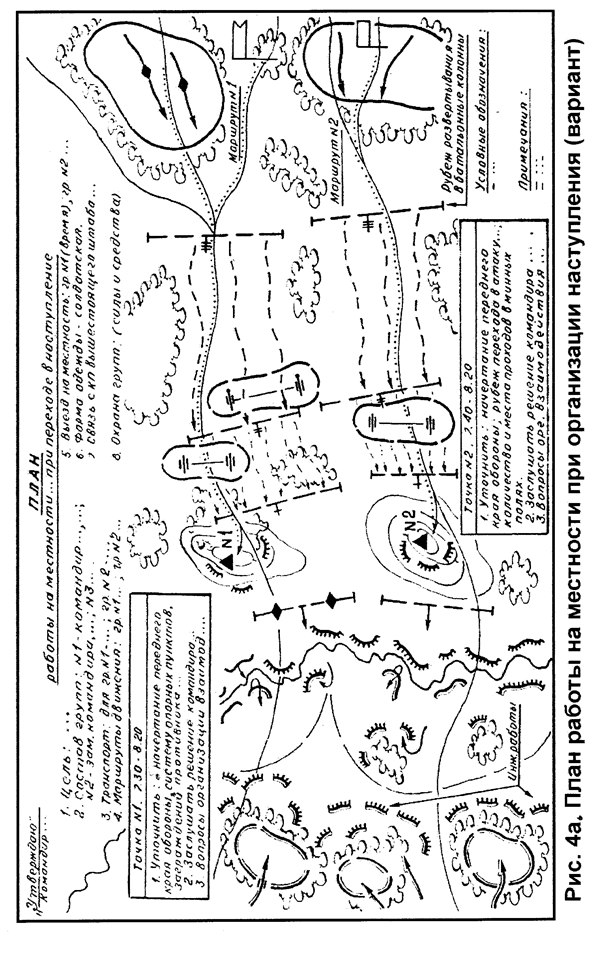 4.6 Подготовка наступления Подготовка наступления начинается с его организации - принятия решения командиром, проведения рекогносцировки, постановки боевых задач подразделениям, организации взаимодействия, огневого поражения противника, всестороннего обеспечения боя, подготовки подразделений к выполнению боевой задачи, подготовка исходного района (положения) для наступления, осуществления контроля готовности подразделений. Качественные изменения в средствах вооруженной борьбы существенным образом сказываются на способах подготовки наступления. С одной стороны, резко возрос объем и усложнились задачи, решаемые командиром и штабом в этот период, с другой - сокращается время на их выполнение. Если в период Великой Отечественной войны для подготовки наступления в звене полк-батальон затрачивалось обычно 3-4 суток, то теперь это время значительно сократилось. В условиях острого дефицита времени важно правильно распределить время, отводимое на подготовку наступления. Чем слаженнее и оперативнее работают командир и штаб, тем меньше времени они тратят на решение своих вопросов, тем большую его часть предоставляют подчиненным. Принимая решение на наступление, командир уясняет задачу, оценивает обстановку, противника, состояние и возможности своих войск, соседей, характер местности, состояние района боевых действий, погоды, время года, суток и другие факторы. При уяснении задачи важно четко определить роль и место своего подразделения в бою; основы организации взаимодействия с силами и средствами старшего начальника и соседями; уяснить, каков замысел вышестоящего командира на бой, где сосредоточиваются им основные усилия, как строится боевой порядок, каковы порядок огневого поражения противника, система взаимодействия и управления; время готовности к наступлению; время, отводимое на подготовку к бою. После уяснения задачи командир определяет мероприятия, которые необходимо провести для подготовки подразделений к выполнению боевой задачи, производит расчет времени, отдает указания подчиненным командирам по подготовке к выполнению боевой задачи, о времени и порядке работы на местности. При расчете времени определяется, когда получена задача и когда назначена готовность к наступлению. На основе этого определяются бюджет времени на подготовку в бою, сколько из него имеется светлого времени и как его распределить на организацию боя (уяснение боевой задачи, отдачу указаний командирам по подготовке к выполнению боевой задачи, порядок работы на местности); сколько времени отводится на оценку обстановки и принятие решения, рекогносцировку, постановку задач подразделениям, организацию взаимодействия и огневого поражения, всестороннего обеспечения и управления; время, отводимое на практическую работу в подразделениях, проведение перегруппировки подразделений и смены. При оценке противника изучаются: общая группировка и возможный характер его действий; нумерация подразделений, обороняющихся перед фронтом наступления батальона и на флангах; начертание переднего края обороны места расположения огневых средств, особенно ПТС, на переднем крае и в ближайшей глубине; наличие минно-взрывных заграждений; расположение опорных пунктов; наличие открытых флангов и промежутков между опорными пунктами, как и чем они прикр