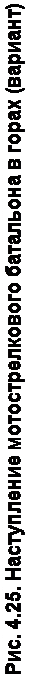 ливаются мотострелковыми и инженерно-саперными подразделениями. При действии на труднодоступной местности танки обычно придаются мотосрелковым подразделениям или используются в резерве. При наступлении вдоль узкой долины, где не представляется возможным одновременно развернуть подразделения батальона, его боевой порядок строится более глубоким, вытянутым вдоль долины, а при наступлении поперек горного хребта он может растягиваться вдоль фронта, может быть вогнутым в ту или иную сторону в зависимости от форм рельефа. При наличии открытого фланга целесообразно боевой порядок строить уступом в сторону фланга или уступом вперед, если оба фланга являются угрожаемыми. Особенно часто такое построение применяется при наступлении вдоль теснины (ущелья). В связи с резким изменением обстановки в подразделениях важно иметь сильные резервы, которые должны быть готовы противодействовать охватам и обходам противника, охранять тыловые подразделения, пункты управления, вести борьбу с диверсионно-террористическими группами противника, наращивать усилия на главном направлении. Важную роль при действии в горах играют тактические воздушные десанты. На них возлагаются задачи по захвату перевалов, горных проходов, узлов дорог и других важных объектов в тылу противника. Являясь важным средством увеличения глубины одновременного воздействия на противника, они способствуют изоляции районов, воспрещают подход резервов противника из глубины. Состав десанта может быть различным. Для захвата важного объекта (горного перевала или узла дорог) может выделяться парашютно-десантный (мотострелковый) батальон. Артиллерия при наступлении в горах распределяется, исходя из необходимости обеспечить самостоятельность действий мотострелковых, танковых подразделений. С целью создания наиболее благоприятных условий для ведения огня прямой наводкой отдельные орудия, батареи могут выдвигаться на командные высоты, скаты хребта. Подразделения зенитной артиллерии располагаются в боевых порядках с учетом горного рельефа и возможности внезапного появления самолетов и вертолетов противника на малых высотах. Орудия располагаются на высотах и склонах хребтов на различных уровнях в готовности к ведению огня по целям, летящим ниже горизонта орудия. Отдельные батареи целесообразно располагать на дорогах и в долине, где ожидается скрытый подход самолетов и вертолетов на малых высотах. Авиация сосредоточивает свои усилия прежде всего на подавлении объектов противника, расположенных в глубине обороны, которые находятся вне пределов досягаемости огня артиллерии. Особое значение имеет поражение целей за гребнями хребтов и на обратных скатах высот, разрушение переправ, создание завалов на дорогах и перевалах. С началом атаки мотострелковых и танковых подразделений основные усилия артиллерии и минометов сосредоточиваются на подавлении целей и объектов, которые расположены непосредственно на направлении их действий, особенно фланкирующих огневых средств противника, находящихся на скатах высот и выступающих отрогах хребтов. Все огневые средства противника при многоярусном их расположении на скатах высот подавляются одновременно, но наиболее плотный огонь сосредоточивается по целям, расположенным на нижнем ярусе. Для обеспечения продвижен