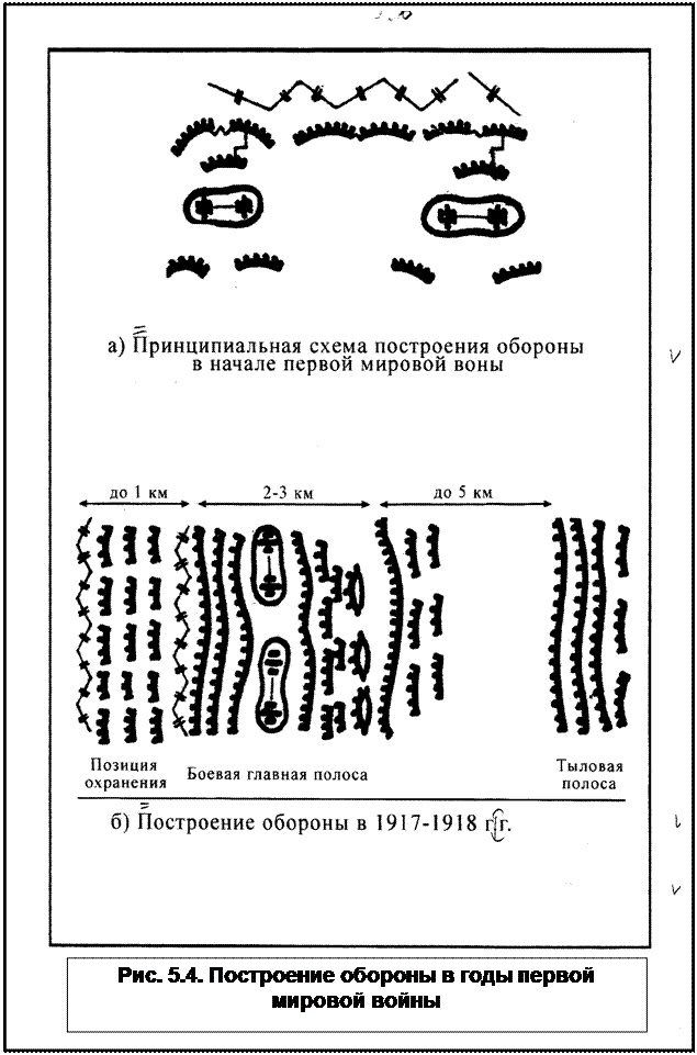 стью. Новый бездымный порох усиливал огонь ручного и артиллерийского оружия и облегчал маскировку орудий, ведущих огонь. Это первая из войн, когда огонь стал господствовать на поле боя. Искусство буров проявилось в этой войне в том, что они сумели нейтрализовать преимущество англичан в огневом отношении за счет умелого использования в обороне выгодных условий местности, создания полевых укреплений, применения военной хитрости. Их позиция, располагавшаяся пятикилометровым полукругом, была настолько хорошо замаскирована, что командовавший английским войском Мэтуэн, лично выехавший для рекогносцировки местности, не заметил расположения значительной группировки буров. Начавшаяся затем атака англичан была отбита бурами с большими потерями для наступающих. Немало нового в развитие обороны внесла русско-японская война, в ходе которой впервые образовался сплошной позиционный фронт на многие десятки километров. Полевая оборона обрела глубину в начале до 3-5, а затем и на десятки километров. В ее устойчивости большую роль стали играть инженерные заграждения. Сильные стороны обороны особенно ярко проявились во время Первой мировой войны. Важными тенденциями в ее развитии явились увеличение глубины, повышение противотанковой, противоартиллерийской, противохимической и противоавиационной устойчивости. От очаговой обороны, равномерного распределения пехоты в первой линии окопов в начале войны войска перешли в последующем к траншейной обороне, с созданием сильных опорных пунктов и огневых мешков между ними (рис. 5.4). В обороне огневая активность проявилась с небывалой силой. Использование ружейно-пулеметного и артиллерийского огня в сочетании с устройством инженерных заграждений, фортификационным оборудованием местности и нанесением контратак сделало оборону непреодолимой для наступающего. Она сумела противостоять его ударной силе даже тогда, когда поя-