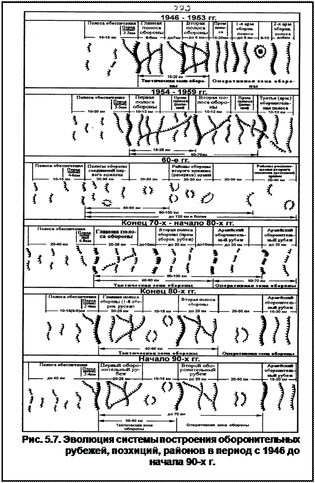 Главная направленность совершенствования вооружения в зарубежных армиях, как отмечается в зарубежной печати, состоит в том, чтобы увеличить разрыв в технологическом отношении между наступательными и оборонительными средствами. Советское военное искусство в послевоенный период достаточно глубоко и всесторонне оценивало тенденцию нарастающего ударного потенциала зарубежных армий в результате совершенствования вооружения, оргштатной структуры войск, внедрения новейших систем управления. На рис. 5.7 показано какую сложную эволюцию в связи с этим претерпела по взглядам советского военного командования система оборонительных рубежей, пози-