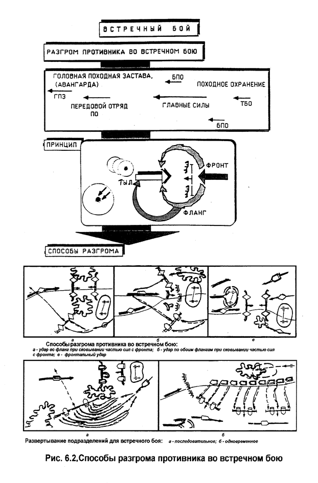 6.2. Условия возникновения и характерные черты современного встречного боя. Прогнозируя характер современных боевых действий, можно сделать вывод о возможности более частого, чем в прошлом, возникновения встречных боев. Это обусловливается повышением динамичности, маневренности и пространственного размаха современных операций, стремлением противоборствующих сторон добиваться решительных целей в более короткие сроки. Есть основание полагать, что повысится удельный вес встречных боев в начальный период войны, когда характерным явится борьба за захват инициативы, упреждение противника в развертывании и нанесении ударов. Встречные столкновения могут возникать в результате сближения двигающихся навстречу друг другу войск и вступлением их в бой из походных колонн; в наступлении - при завязке боя с резервами противника, для проведения контратак; в ходе преследования отходящего противника в результате столкновения с его резервами, подтягиваемыми из глубины; в ходе осуществления маневра в целях окружения противника при столкновении с его частями, пытающимися противодействовать окружению; при отражении удара противника, предпринимаемого в целях деблокирования окруженной группировки. В обороне встречный бой может возникнуть при выдвижении вторых эшелонов для проведения контратак, для закрытия бреши, а также при выдвижении подразделений для уничтожения воздушных, морских десантов и аэромобильных формирований (рис.6.1.). Встречный бой в современных условиях характеризуется: быстрым сближением подразделений и вступлением их в бой с ходу; недостаточной ясностью обстановки, резкими и быстрыми ее изменениями, а также скоротечностью боевых действий; напряженной борьбой за выигрыш времени, захват и удержание инициативы; развертыванием боевых действий на широком фронте; свободой маневра и наличием значительных промежутков и открытых флангов; ограниченным временем на организацию боя. Быстрота сближения сторон определяется высокой подвижностью войск. Так, если подразделения будут двигаться навстречу друг другу со скоростью 25-30 км/ч, то общая скорость их сближения составит 50-60 км/ч. Вследствие этого командир и штаб будут располагать крайне ограниченным временем для организации боя. Это требует от них высокой оперативности и слаженности в работе, а от войск – быстроты и четкости действий, незамедлительного выполнения команд и распоряжений. Учитывая это, важно заблаговременно, еще в предвидении встречного боя, провести ряд мероприятий, способствующих его организации в короткие сроки и достижению успеха, определить рубежи вероятной встречи с противником и замысел действий на них; создать соответствующую группировку сил и средств на марше; организовать техническое и тыловое обеспечение. Вступление войск в бой с ходу, сразу после сближения сторон, обусловливается решительностью целей и задач, стремлением упредить противника в действиях, динамичностью самого боя. Развертывание подразделений
