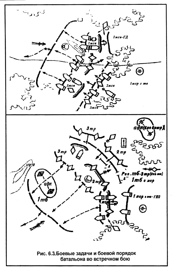 6.4. Боевые задачи и построение боевого порядка подразделений Содержание боевых задач (рис.6.3) подразделений во встречном бою зависит от их роли и места в боевом порядке части, замысла командира на бой, состава и боевых возможностей подразделений, важности направления наступления, состава группировки и возможностей противника, степени его огневого поражения. Батальону во встречном бою обычно ставится ближайшая задача и указывается направление продолжения наступления. Определение батальону
