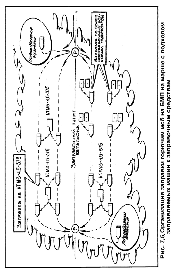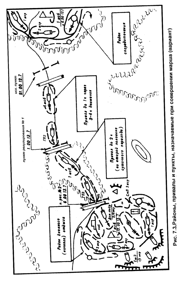 в походном порядке, не допустить задержки и смешивания подразделений. Время прохождения исходного рубежа (пункта) головой колонны главных сил считается началом марша. Формирование колонн, их вытягивание к исходному рубежу (пункту) проводится с таким расчетом, чтобы пройти его в установленное время. Исходный пункт назначается на удалении, обеспечивающем вытягивание колонны и набор заданной скорости движения. В зависимости от глубины колонны и условий местности он может быть назначен на удалении 5-10 км от передней границы района расположения подразделения. Дистанции между машинами назначаются в зависимости от скорости движения, условий местности. Обычно они составляют 25-50 м. Рубежи (пункт) регулирования назначаются для обеспечения планомерного и организованного совершения марша, с тем, чтобы регулировать скорость движения колонны и таким образом добиться своевременного прибытия подразделений в район назначения. Рубежи регулирования обычно назначаются через 3-4 часа движения. Для отдыха личного состава, проверки состояния вооружения и техники и их технического обслуживания в ходе марша назначаются привалы продолжительностью до одного часа и один привал продолжительностью 2 часа во второй половине суточного перехода. В конце каждого суточного перехода назначается дневной (ночной) отдых. Район привалов, дневного (ночного) отдыха, а также суточного отдыха определяются старшим командиром. Они выбираются с таким расчетом, чтобы находиться в районе прикрытия средств ПВО старшего начальника. Местность должна обеспечить рассредоточенное расположение подразделений, маскировку их от воздушного и наземного противника, защиту от оружия массового поражения. На привалах построение колонны батальона не нарушается. Все подразделения останавливаются одновременно, дистанции между ними сохраняются. Боевые и транспортные машины останавливаются у правой обочине дороги не ближе 10 м одна от другой. Проверяется техническое состояние боевых и транспортных машин, устраняются выявленные недостатки. В районах привала и отдыха организуется непосредственное охранение в каждом подразделении. Походный порядок включает, как правило, следующие элементы: походное охранение, колонну главных сил и замыкание. Батальон совершает марш одной колонной. При совершении марша в предвидении вступления в бой от полка (бригады) высылается передовой отряд в составе усиленного батальона. Его задача – упредить противника в захвате выгодного рубежа и удержать его до подхода главных сил. Походный порядок батальона, назначенного в передовой отряд, строится с расчетом быстрого развертывания в боевой порядок и вступления в бой. Он состоит из колонны главных сил и походного охранения. Танковые подразделения, приданные мотострелковому батальону, как правило, следуют в голове, а мотострелковые подразделения, приданные танковому батальону, обычно распределяются между танковыми ротами и следуют в их походных порядках за танками или назначаются в походное охранение. Артиллерийское подразделение следует за боевыми подразделениями батальона. Противотанковый взвод батальона следует за головной походной заставой или за головной ротой главных сил батальона в готовности к отражению атак танков противника. Гранатометный взвод батальона следует обычно за г