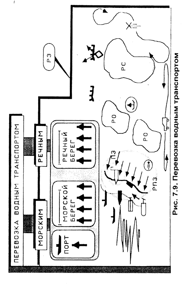 Одновременно с уточнением расчетов на перевозку командир проводит рекогносцировку в целях изучения аэродромов и условий погрузки подразделений, уточнения исходного района, районов ожидания и путей подхода к ним. Для погрузки и выгрузки части, как правило, назначается несколько основных и запасных аэродромов. Перед погрузкой подразделение, следующее одним рейсом, выходит в район ожидания. С занятием района ожидания штаб батальона организует связь со штабом авиационного подразделения, осуществляющего перевозку, а также с военными комендантами аэродромов. Командно-наблюдательный пункт батальона, как правило, располагается рядом с пунктом управления авиационной части, осуществляющей перевозку, и оттуда организует выход подразделений. По установленному сигналу подразделения выдвигаются из исходных районов в район ожидания и на аэродромы погрузки. Погрузка осуществляется по указанию авиационных командиров. Командир батальона следует на одном самолете (вертолете) с командиром части (отряда) военно-транспортной (гражданской) авиации. Командиры подразделений, как правило, следуют в самолетах командиров эскадрилий. Один из заместителей командира батальона с небольшой группой офицеров остается для обеспечения погрузки остальных подразделений, и вылетают последним рейсом. Связь со старшим командиром, с подразделениями, находящимися в воздухе, а также в исходном районе, осуществляется через командный пункт авиационной части. В районе выгрузки командир батальона, прежде всего, устанавливает связь со своим старшим командиром или с командиров, в чье распоряжение он поступает. После выгрузки подразделения быстро приводятся в боевую готовность для выполнения боевых задач. Сложным делом является перевозка войск водным (морским или речным) транспортом (рис.7.9.). Для ее осуществления выделяется необходимое количество десантных кораблей, транспортных и других средств, определяются пункты и сроки их сосредоточения, пункты погрузки и выгрузки, время