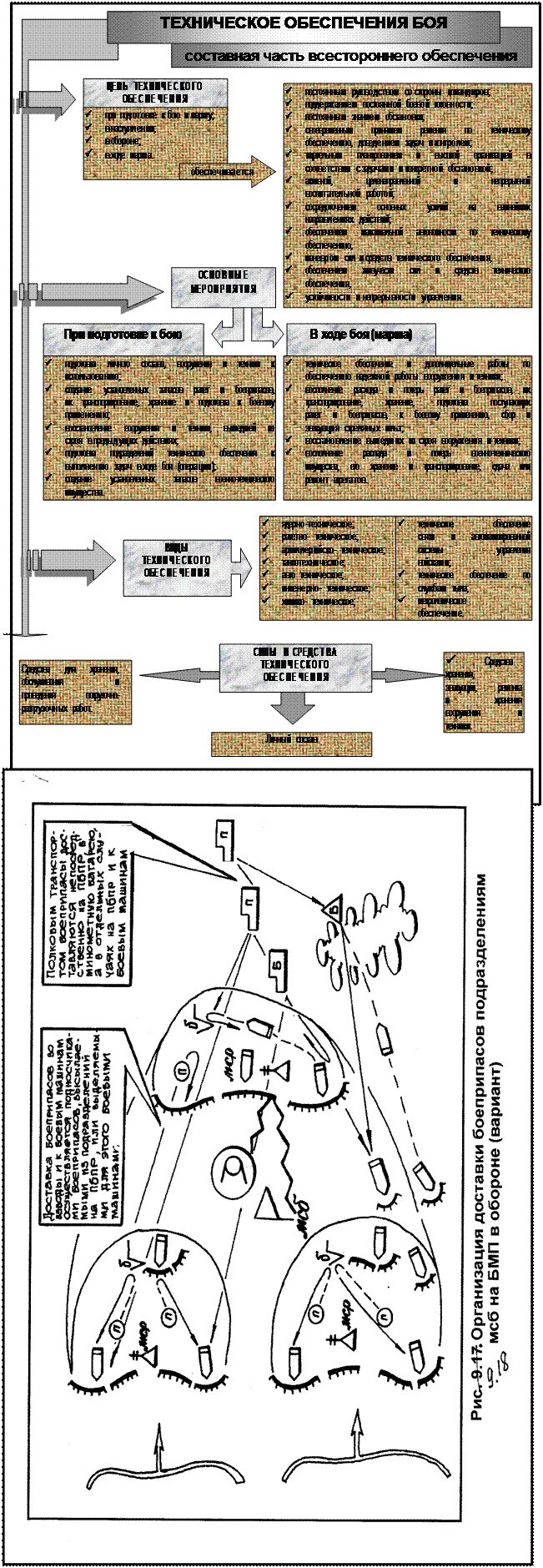 9.8. Техническое обеспечение Зачатки технического обеспечения появились вместе с зарождением артиллерии, применением в бою инженерной и другой техники. Наибольшее развитие техническое обеспечение получило в войнах ХХ в. в связи с массовым внедрением в войска боевых и транспортных машин. Однако в течение довольно длительного времени, включая и вторую мировую войну, задачи технического обеспечения решались в рамках тылового обеспечения. И лишь в послевоенное время в связи с полной моторизацией и механизацией общевойсковых соединений и частей, насыщением их большим количеством разнообразной техники и оружия возникла настоятельная потребность выделить его в самостоятельный вид обеспечения. Уже в Великую Отечественную войну служба технического обеспечения функционировала с большим напряжением. На нее возлагались задачи по техническому обслуживанию вооружения, эвакуации и ремонту неисправной техники, восполнению расхода боеприпасов, сбору и эвакуация стреляных гильз и их укупорка, своевременное обеспечение подразделений военно-техническим имуществом. Войска несли немалые потери в вооружении и технике в ходе боев, особенно при прорыве подготовленной обороны противника. В наступательных операциях 1944-1945 г.г. в среднем потери в танках в танковых частях ежесуточно составляли 15-17% от состава. В обороне при отражении атак противника потери в танках и самоходно-артиллерийских установках достигали ежесуточно в среднем 13-14%. Служба технического обеспечения должна была своевременно эвакуировать поврежденную технику и организовать ее ремонт. В ходе войны была выработана довольно эффективная система ремонта к эвакуации техники. В 1943 г. были созданы ремонтные органы полевого типа. В армиях появились специальные ремонтно-восстановительные батальоны для отдельно бронетанковой и отдельно автотракторной техники. Они оснащались более производительной техникой для ремонта машин и вооружения. Эвакуационные подразделения (были созданы эвакороты) выдвигались ближе к войскам, что позволяло своевременно подбирать с поля боя подбитые машины и орудия и эвакуировать их на ближайшие сборные пункты аварийных машин, где развертывались ремонтно-восстановительные подразделения. Текущий ремонт машин производился непосредственно на поле боя в ближайших укрытиях и в ремонтных мастерских частей и соединений. Средний и капитальный ремонт бронетанковой техники осуществлялся армейскими, а капитальный ремонт - фронтовыми средствами. Для среднего ремонта боевых машин и автотранспорта в общевойсковых и танковых объединениях создавались сборные пункты аварийных машин, куда эвакуировались танки и самоходно-артиллериские установки, которые не могли быть отремонтированы штатными ремонтными средствами танковых (механизированных) бригад и корпусов, a также других частей и соединений. Капитальный и средний ремонт автотракторной техники осуществлялся армейскими средствами, а текущий и частично средний ремонт - средствами соединений. В первую очередь восстанавливалась та техника, которая не требовала продолжительного ремонта и могла быть возвращена в строй в короткие сроки. Полученный во время Великой Отечественной войны опыт организации и осуществления технического обеспечения во многом сохраняет свою ценность и в современных усло