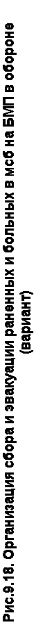 не должна превышать 18-20 кг, а для военнослужащих других родов войск - 30 кг, не считая массы основных носимых предметов обмундирования (одежды и обуви). Нагрузка на солдата в 50-70 кг (более половины его собственного веса) приводит к большим энергозатратам, повышенной утомляемости, серьезно снижает его боеспособность, у него сбивается дыхание и учащается пульс, повышается артериальное давление, быстро устают мышцы ног, рук и плеч. Много проблем в тыловом обеспечении войск выявилось при проведении двух чеченских кампаний. Выявилось, что техническая оснащенность тыла обладает низкой устойчивостью к поражающим факторам оружия противника, а его мобильность не соответствует мобильности войск. Почти вся техника тыла имеет низкую проходимость, не способна преодолевать водные преграды с ходу, не может осуществлять маневр материальными средствами в районах разрушений, затоплений, пожаров. Она обладает низкими возможностями по содержанию и подъему запасов материальных средств, особенно боеприпасов всех видов, оказанию медицинской помощи и эвакуации раненных и больных, обеспечению погрузочно-разгрузочных работ. Существующая организационно-штатная структура войскового тыла не обеспечивает гибкости и автономности подразделений в материальном и медицинском отношении. Отсутствие штатных подразделений защиты, охраны и обороны тыла, инженерных подразделений и подразделений ПВО, воздушного транспорта резко снижают работоспособность системы войскового тыла. Опыт показал, что в мотострелковом батальоне следует иметь взвод материального обеспечения, состоящий из трех автомобильных и хозяйственного отделений. Техника автомобильных отделений должна иметь противопульную и противоосколочную броню. В мотострелковой бригаде целесообразно иметь батальон материального обеспечения в составе трех рот: роту подвоза боеприпасов, роту подвоза горючего и смазочных материалов, роту подвоза продовольствия, вещевого и военно-технического имущества, а также объединенный склад и хлебозавод. По службе горючего запасы в частях и подразделениях должны поддерживаться в объеме войсковых. По продовольственной службе необходимо дополнительно к штатным средствам иметь в батальоне 6-10 комплектов КП-20, и 1 комплект ПП-40. По вещевой службе требуется создать запасы текущего обеспечения по таким предметам, как бронежилеты, свитера полушерстяные, подшлемники полушерстяные, шапочки полушерстяные, сапоги резиновые, мешки ватные с вкладышами. По медицинскому обеспечению – иметь в каждом взводе боевого подразделения санитарного инструктора, в звене рота – батальон иметь на оснащении носимые комплекты для оказания доврачебной помощи, полимерные емкости для инфузорной терапии на поле боя и ряд других необходимых медицинских изделий. На рис.9.18 и 9.19 показана предлагаемая организация сбора и эвакуации раненных и больных в мотострелковом батальоне на БМП в обороне и наступлении.