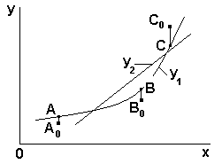 Выше рассматривалась интерполяция, т.е. такой способ аппроксимации, когда значения исходной и аппроксимирующей функций совпадают в узлах некоторой сетки. Однако достаточно часто, например, при аппроксимации большого числа экспериментальных точек, найденных с некоторой погрешностью, интерполяция становится неразумной. Такая же проблема возникает при обработке данных экспериментов, когда на функциональный отклик могут влиять случайные неконтролируемые независимые факторы, искажающие полезную информацию. В этом случае целесообразно строить аппроксимирующую функцию таким образом, чтобы сгладить влияние погрешности измерения как вызывающие незначительные отклонения в результате действия «шума» и т.п. Такое сглаживание обычно называют “приближением”. При этом возникает две проблемы. Первая связана с тем, что тип и общий вид заменяющей функции всегда заранее определяет экспериментатор. Его выбор базируется на чисто визуальной оценке расположения экспериментальных (табличных) точек в пределах выбранной координатной системы (если это возможно). Безусловно, решение в этом случае будет в значительной степени зависеть от опыта и профессионализма экспериментатора. Для определенности и простоты мы будем в дальнейшем рассматривать наиболее часто встречающийся случай, когда аппроксимирующая функция является многочленом. Вторая проблема приближения заключается в следующем. Пусть даны результаты наблюдений, представленные в табличной форме (см. таблицу 17). Представим эту таблицу графически, где в координатной системе xof представлено несколько начальных точек, например, А0, В0, С0, рисунок 19 .. Функцию f(x) аппроксимируем функцией y=φ (х) таким образом, чтобы ее график «усредненно» проходил в области экспериментальных точек, «сглаживая» действие случайных факторов.