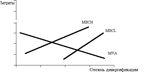 Имеется два главных типа диверсификации - связанная и несвязанная. Связанная диверсификация представляет собой новую область деятельности компании, связанную с существующими областями бизнеса (например, в производстве, маркетинге, материальном снабжении или технологии). Несвязанная диверсификация - новая область деятельности, не имеющая очевидных связей с существующими сферами бизнеса. Большинство компаний обращаются к диверсификации тогда, когда они создают финансовые ресурсы, превосходящие необходимые для поддержания конкурентных преимуществ в первоначальных сферах бизнеса. Диверсификация может осуществляться следующими путями: Диверсификация с помощью внутреннего рынка капиталов выполняет те же функции, что и фондовый рынок. При внутреннем рынке капиталов главный офис играет следующие главные роли: В этих условиях СЗХ представляют собой автономные центры прибыли, находящиеся только под финансовым контролем главного офиса. Стратегия реструктурирования представляет один из видов стратегии внутреннего рынка капиталов. Разница состоит в степени вмешательства главного офиса в действия СЗХ. Компании, которые подвергаются реконструированию, обычно были плохо управляемыми в процессе создания и развития. Цель состоит в помощи им активизировать свою деятельность, изменить образ действий, развить новые стратегии на уровне СЗХ и влить в компанию новые финансовые и технологические ресурсы. В том случае, когда используется стратегия передачи искусства или опыта деятельности, новый вид бизнеса рассматривается как связанный с существующими СЗХ (например, в области производства, маркетинга, снабжения, НИОКР). Обычно используются передачи таких искусств, которые снижают издержки в диверсифицированной компании. Диверсификация путем распределения ресурсов возможна при наличии существенного сходства между одной или несколькими важными функциями существующих и новых СЗХ. Целью распределения ресурсов является реализация синергизма в деятельности компании при использовании общих производств, каналов распространения, средств продвижения, НИОКР и т.д. Таким образом, в каждую СЗХ требуется меньше вложений по сравнению с автономным решением этого вопроса. При решении о диверсификации деятельности компании следует учитывать стоимость управления такой компанией. Эти затраты определяются числом СЗХ и необходимостью координации между ними. Так, затраты на управление больше в компании из 12 СЗХ, которые обладают определенным синергизмом, чем в компании из 10 СЗХ, которые не обладают этим качеством. Это иллюстрировано рис.14. Удельные затраты на управление диверсифицированной компании при высокой потребности в координации (МВСН) сравниваются с таковыми для компании с низкой потребностью в координации (МВСL). Предположим, что компания с высокой потребностью в координации стремится усилить свое положение путем синергизма СЗХ. А компания с малыми потребностями в координации следует стратегии внутреннего рынка капитала или реструктурирования. Как видно, на каждом уровне диверсификации соответствующие значения прямых МВСH больше значений МВСL. Если мы примем, что обе компании имеют одинаковые кривые удельных затрат на управление МVA, компания с низкой нуждой в координации имеет рентабельность управления больше, чем ко