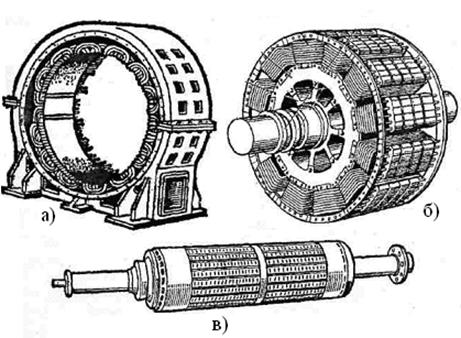 Роторы выполняются явнополюсными (рис. 6, б) или неявнополюсными (рис. 6, в). Явнополюсный ротор имеет выступающие полюсы, на которые надеты катушки обмотки возбуждения. Синхронные машины проектируются так, чтобы количество полюсов вращающегося магнитного поля статора было равно количеству полюсов ротора. От количества полюсов зависит синхронная частота вращения ротора.