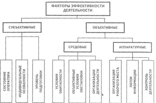 Рис. V.2. Факторы эффективности деятельности Экстериоризация — переход от внутреннего, умственного плана действия к внешнему, реализуемому в форме приемов и действий с предметами. Цель — то, что реализует человеческую потребность и выступает в качестве образа конечного результата деятельности. Деятельность является необходимым условием формирования личности и в то же время зависит от уровня развития личности, выступающей как субъект этой деятельности. В общем виде под деятельностью понимается активность живого организма, направленная на удовлетворение потребностей и регулирующая осознанной целью. В процессе деятельности устанавливается тесное взаимодействие человека с окружающей средой. Как конечный результат деятельности выступает цель, которая может представлять собой реальный предмет, создаваемый человеком, определенные знания, умения, навыки, творческий результат. Побудителем к деятельности выступает мотив. Именно мотив придает деятельности определенную специфику в отношении выбора средств и способов достижения цели. Мотивами могут быть разнообразные потребности, интересы, установки, привычки, эмоциональные состояния. Многообразие деятельности человека порождает и многобразие мотивов. В зависимости от мотивов люди по-раз-ному относятся к своей деятельности. Цель деятельности не равнознач- на ее мотиву, хотя иногда мотив и цель совпадают. Сознательная деятельность челове- ка коренным образом отличается от поведения животных. Эти отличия относятся к следующему: не обязательно связана с биологическими мотивами, не определяется только наглядными впечатлениями, формируется путем усвоения общественного опыта. Деятельность имеет сложную структуру. В ней обычно выделяют несколько уровней: действия, операция, психофизиологические функции. Действия — это процесс, направленный на реализацию цели. Они характеризуются рядом особенностей: первая особенность состоит в том, что действия в качестве необходимого компонента включают акт сознания в виде постановки и удержания цели. Вторая особенность действия — это одновременно и акт поведения, причем внешние действия неразрывно связаны с сознанием. Третья особенность — через понятие «действие» утверждается принцип активности. Четвертая особенность — действия могут быть внешние, привлеченные и внутренние умственные. Предметные действия — это действия, направленные на изменение состояния или свойств предметов внешнего мира. Они складываются из определенных движений. Анализ многообразных предметных Действий показывает, что все они в большинстве случаев складываются из трех относительно простых: взять (поднять), переместить, опустить. Кроме того, в психологии принято выделять еще и другие виды Движений: речевые, соматические, выразительные, локомоторные и т. д. Во всех случаях необходима координация движений и согласованность их друг с другом. Умственные действия — разнообразные действия человека, выполняемые во внутреннем плане сознания. Экспериментально установлено что в умственное действие обязательно включены моторные двигательные компоненты. Умственная деятельность человека часто делится на: перцептивную, посредством которой формируется целостный образ восприятия предметов или явлений; мнемическую, которая входит в состав деятельности за