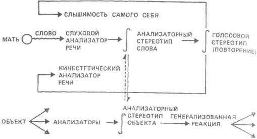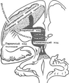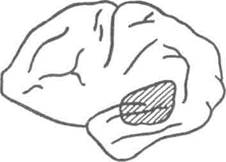 Рис. VI. 1. Участки мозга, поражение которых приводит к распаду фонематического слуха (по А.Р. Лурия) Функция обобщения обусловлена тем, что каждое слово уже обобщает и что это позволяет реализоваться мышлению. Коммуникация (общение) состоит в передаче друг другу определенных сведений, мыслей, чувств и тем самым воздействуя друг на друга. Экспрессия заключается в передаче эмоционального отношения к содержанию речи и к человеку, к которому она обращена. Членораздельность человеческой речи обеспечивает возможность выразить с помощью ограниченного количества речевых знаков — элементов разной сложности (звуков, слогов, слов, предложений) — безграничное многообразие мыслей, намерений и чувств человека. Существует большое число систем знаков (см.) (дорожные, знаки математики, химии, картографические и т. д.). Наиболее важной и универсальной по возможности использования является система естественного (национального по форме — русского, английского и т. д.) языка. Его основными функциями являются: хранение и передача общественно-исторического опыта (наряду с мате- риальными орудиями и продуктами труда); общение (коммуникативная функция). Перечислим основные группы механизмов речи (по Н. И. Жинкину): I. Механизм программирования речевого высказывания. II. Группа механизмов, связанных с переходом от плана программы к грамматической (синтаксической) структуре предложения, включает: механизмы грамматического прогнозирования синтаксической конструкции; механизм, обеспечивающий запоминание, хранение и реализацию грамматических характеристик слов; механизм перехода от одного типа конструкции к другому (трансформации); механизм развертывания элементов программы в грамматические конструкции и др. III. Механизмы, обеспечивающие поиск нужного слова по семантическим и звуковым признакам, и механизм моторного программирования синтагмы. IV. Механизм выбора звуков речи и перехода от моторной программы к ее «заполнению» звуками. V. Механизмы, обеспечивающие реальное осуществление звучания речи. Речевая деятельность связана с работой больших полушарий головного мозга. Левое полушарие является ведущим в речевой деятельности. Правое влияет на модуляцию голоса, тембр и т. п. Речевая афферентация идет по трем каналам: двигательному, слуховому и зрительному. Речевые звуки возникают при подаче воздуха из легких в вибраторы (голосовые связки гортани), щели и затворы, образующиеся во рту при артикуляции языка и губ. Синтез определенных для данного звука сос-тавляющих (формант) происходит в резонаторах, включающих рот, глот-ку и полость носа. Здесь звук как бы фильтруется: одни обертоны ослабляется или отсеиваются, другие усиливаются. Речевые зоны коры представлены десколькими анализаторами, тесно взаимодействующими друг с другом и координационно связанными со всей деятельностью нервной системы. Речь носит рефлекторный характер. Ее мозговую структуру составляют второсигнальные связи. Но пер-восигнальные компоненты тоже всегда включаются в речевой рефлекс в виде звучания (устная речь), оптических моментов (зрительная речь) и т. д. Однако своеобразие речи каждого человека объясняется прежде всего социальными факторами. Для произнесения речевых звуков необходимы: 1) струя воздуха, энергия которой нужна для возбуждения звука; 2) звуковой вибратор; 3