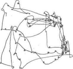 Рис. VUi.2. Движение глаз в процессе свободного рассматривания картины (опыты Ярбуса) реакции (сужение сосудов), иногда в виде мышечных реакций (поворот глаз, напряжение мышц и т. д.). Установлено, что сложные ощущения, требующие различения или узнавания предмета, вообще невозможны без активных движений. Так, чтобы различить с закрытыми глазами предмет, необходимо активно ощупать его. Такие признаки предмета, как гладкость и шероховатость, величина и т. п., воспринимаются, если ощупывающая рука активно движется. Участие двигательных компонентов в ощущении может осуществляться на разном уровне, протекая иногда как элементарный рефлекторный процесс (например, при мышечных напряжениях), а иногда как сложный процесс активной рецепторной деятельности (например, при распознавании сложного изображения — см. рис. VIII.2). В процессе длительного исторического развития сформировались осо- бые воспринимающие органы (органы чувств или рецепторы) (см.), которые специализировались на отражении различных видов движения материи-кожные рецепторы отражают механические воздействия; слуховые — зву. ковые колебания; зрительные — электромагнитные колебания и т. д. Высокая специализированность присуща не только рецепторам, но и нейронам, входящим в состав центральных нервных аппаратов, до которых доходят сигналы, воспринимаемые периферическими органами чувств. Различают раздражители, адекватные для данного органа чувств и неадекватные для него. Это свидетельствует о тонкой специализации органов чувств. Специализация органов чувств — продукт эволюции, а сами органы чувств — продукт приспособления к воздействиям внешней среды. Представительство различных видов ощущений в коре головного мозга зависит от их значимости. Анатомо-физиологический аппарат, специализированный для приема воздействий определенных раздражителей из внешней и внутренней среды и переработки их в ощущения, И.П. Павлов назвал анализатором. Каждый анализатор состоит из трех частей: I — периферического отдела, или рецептора, где происходит трансформация определенного вида воздействия энергии в нервный процесс, их называют органами чувств. Органы чувств отличаются повышенной чувствительностью и приспосабливаются для восприятия определенных раздражителей. II — чувствительных нервов (афферентных, или центростремительных, проводящих путей), по которым возбуждение передается в центральный отдел анализатора.