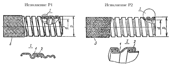 Рис.2.1. Схемы конструкции рукавов с оплеткой: Металлические рукава имеют гофрированную внутреннюю трубу, выполненную из бронзовой или стальной ленты, и наружную проволочную оплетку. Между витками ленты находится уплотнитель. Рукава с хлопчатобумажным уплотнением предназначены для работы с температурой рабочей жидкости до 110 С, а с асбестовым уплотнением - до 300 С. Металлические рукава применяют в специфических условиях эксплуатации гидросистем, в контакте с агрессивными рабочими жидкостями.