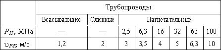 где Q - расход жидкости, м3/с для (2.1) и л/мин для (2.2); Скорость течения жидкости в трубопроводах зависит в основном от давления в гидросистеме (табл.2.2). Таблица 2.2 Рекомендуемые значения скорости рабочей жидкости