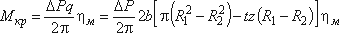 где b - ширина ротора; R1 и R2 - радиусы дуг, образующих профиль внутренней поверхности статора; t - толщина платин; z - число пластин; α - угол наклона пластин к радиусу. Пластинчатые гидромоторы могут быть также одно-, двух- и многократного действия. Пластинчатые гидромоторы от пластинчатых насосов отличаются тем, что в их конструкцию включены устройства, обеспечивающие постоянный прижим пластин к статорному кольцу. При подводе к машине жидкости на рабочую поверхность пластин действует сила, создающая крутящий момент на валу гидромотора, который для гидромоторов однократного действия определяется по формуле: