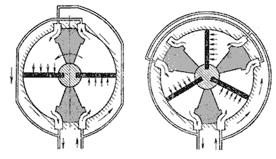 Для возвратно-поворотных движений приводимых узлов на угол, меньший 360, применяют поворотные гидроцилиндры (рис.4.7.), которые представляют собой объемный гидродвигатель с возвратно-поворотным движением выходного звена.