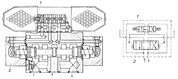 Рис.5.5. Гидрораспределитель с электрогидравлическим управлением В зависимости от числа золотников гидрораспределители подразделяют на распределители с одним и несколькими золотниками. В последнем случае распределители могту быть моноблочными или секционными. Секции распределителя соединяют между собой болтами. На рис.5.6 представлен моноблочный гидрораспределитель.