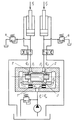 Рис.6.9. Делитель потока: Делитель потока (рис.6.9) состоит из двух нерегулируемых дросселей 1 и двух дросселей 2, проходные сечения которых могут автоматически изменяться благодаря перемещению плунжера 3. При равенстве нагрузок (F1 = F2) и площадей поршней гидроцилиндров давление P1 = P2, перепад давлений Δ P = (P3 - P4) = 0, плунжер 3 делителя занимает среднее положение, а расходы в обеих линиях одинаковые. Если нагрузка на один из любых гидродвигателей изменится, то под действием возникшего перепада давлений у плунжера делителя он начнет смещаться из среднего положения, изменяя одновременно проходные сечения дросселей 2. Перемещение прекратится, когда давления P3 и P4 выровняются. В этом положении плунжера расходы в обеих ветвях будут одинаковыми. Таким образом, поддержание равенства расходов в обеих ветвях осуществляется за счет дросселирования потока в той ветви, где гидродвигатель нагружен меньше. Делитель потока может также быть и сумматором потока (рис.6.9, в). В этом случае в подводимых к нему двух трубопроводах поддерживается постоянный расход рабочей жидкости.
