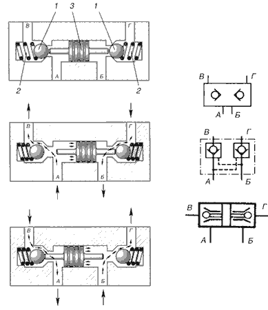 Рис.7.23. Односторонний гидрозамок Односторонний гидрозамок (рис.7.23) имеет толкатель 3, запорно-регулирующий элемент 1 и нерегулируемую пружину 2, которые образуют подобие обратного клапана. У одностороннего гидрозамка выполнено три подвода, соединенные с тремя полостями гидрозамка А, Б и У. При подаче рабочей жидкости под давлением в полость А (рис.7.23, а), открывается запорно-регулирующий элемент 1, и жидкость начинает свободно проходить в полость Б (рис. 7.23, б). Управляющее воздействие отсутствует, т.е. в полость У давление жидкости не подается. При подводе рабочей жидкости к полости Б клапан закрыт (рис.7.23, в). Однако, если одновременно с этим подвести жидкость к полости У (подать управляющее воздействие), то толкатель 3 перемещаясь вверх откроет запорно-регулирующий элемент. В этом случае жидкость будет свободно проходить из полости Б в полость А (рис.7.23, г), пока будет присутствовать управляющее воздействие в полости У. Односторонние гидрозамки применяются для блокировки движения выходного звена гидродвигателя в одном направлении. Для блокировки выходного звена в двух направлениях применяются двухсторонние гидрозамки. Двухсторонний гидрозамок (рис.7.24) имеет в своем корпусе два запорно-регулирующих элемента 1, две нерегулируемые пружины 2, а между ними плавающий толкатель 3 (рис.7.24, а). При подводе рабочей жидкости под давлением к каналу А открывается запорно-регулирующий элемент 1, и жидкость свободно поступает в канал В и далее к гидродвигателю (например в поршневую полость гидроцилиндра). Одновременно с этим толкатель 3 гидрозамка перемещается вправо и открывает второй запорно-регулирующий элемент, обеспечивая пропуск жидкости (например, от штоковой полости гидроцилиндра) из канала Г в канал Б и далее в сливную магистраль. Аналогично гидрозамок работает при реверсе движения выходного звена гидродвигателя. Если жидкость под давлением не подводится ни к одному из каналов (А или В), то рабочие элементы 1 снова занимают положение, указанное на рис.7.24, а. Полости гидродвигателя блокируются от слива, тем самым, блокируя выходное звено гидродвигателя от перемещений.