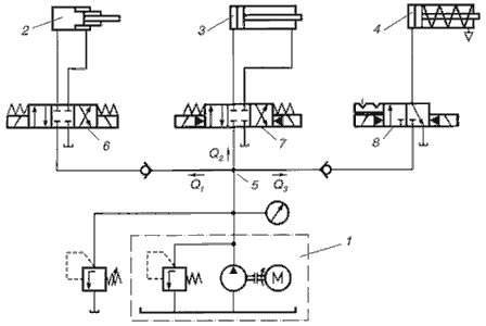 Многие гидросистемы имеют несколько гидродвигателей, питаемые от одного насоса. При такой схеме возможны два варианта подключения гидродвигателей. Гидросистема с параллельным включением гидропривода показана на рис.10.10. Гидросистема имеет одну общую насосную станцию 1 и три гидроцилиндра 2, 3 и 4. Каждый из гидроцилиндров имеет собственное независимое устройство управления - гидрораспределители 6, 7 и 8. В точке 5 гидролиния имеет разветвление, в котором общая подача насосной станции 1 делится на три части Q1, Q2 и Q3 . Каждый из гидроцилиндров может включаться в работу в любой момент времени, независимо от других потребителей, и совершать как холостой, так и рабочий ход.