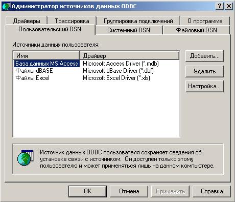 Задание ODBC-источника данных (DSN - data source name) является действием, которое осуществляется средствами операционной системы, управляющей компьютером. В частности, в операционных средах Windows 95/Windows 98 для этого в Панели управления предусмотрен пункт Источники Данных ODBC (32 разр), из которого вызывается Администратор источников данных ODBC. С его помощью могут быть заданы: - пользовательский DSN - источник данных, доступный только текущему пользователю на текущем компьютере; - файловый DSN - источник данных, которые могут применять совместно различные пользователи, у которых установлены одинаковые ODBC-драйверы; - системный DSN - источник данных, доступный всем пользователям и службам текущего компьютера. Окно Администратор источников данных ODBC показано на рис. 10.31.