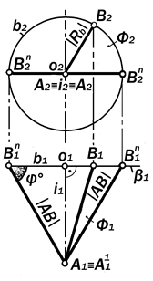 Утверждение 11.3. Если конец А отрезка АВ прямой а принадлежит оси і ^ П1 , то, вращаясь вокруг неё, этот отрезок образует коническую поверх -ность Ф с вершиной в точке А и осно-ванием, -окружностью b радиуса RВ, равного расстоянию от точки В до оси і. Утверждение 11.4. Если ось вра-щения і ^ П1 и проходит через конец А отрезка АВ, то в процессе преобра-зования его проекций внутренняя мет-рика горизонтальной проекции А1В1 не изменяется, а внутренняя метрика её фронтальной проекции А2В2 изменяет-ся от значения натуральной величины высоты |AO| = A2O2 образуемой кони-ческой поверхности Ф (в положении отрезка АВ || П3) до значения нату-ральной величины |AB| = A2B2 самого отрезка АВ в его положении, паралле-льном П2. Утверждение 11.5. Если отрезокАВ из общего положения поворачива-ется вокруг оси і ^ П1 до положения фронтальной линии уровня, то угол j ° наклона её фронтальной проекции А2В2 = | AB | к оси х12 равен натуральной величине угла наклона j ° отрезка АВ к плоскости П1 (см.рис.11.6).